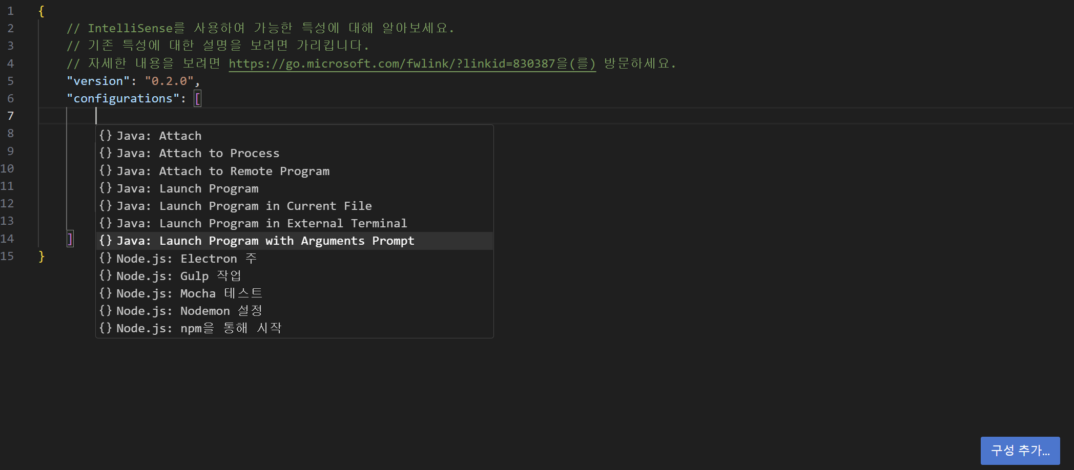 하단 구성 추가 > Java: Launch Program with Arguments Prompt > 저장