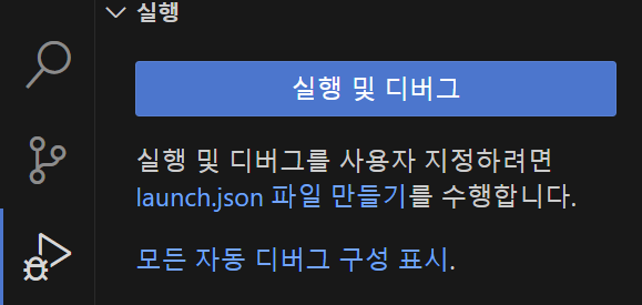 좌측의 Run and Debug 버튼 > launch.json 파일 만들기