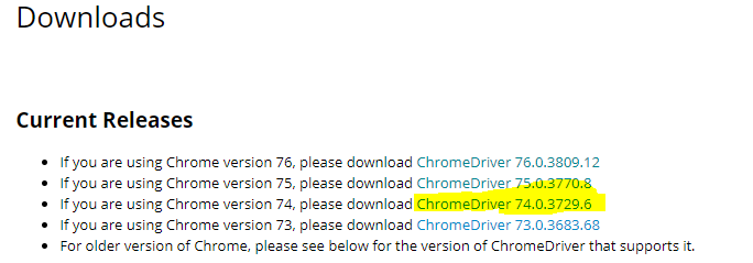 저는 chrome driver를 위에서 보이는 74.x 버전대를 다운로드 받아서 크롬드라이버 경로를 74.x 버전 대로 잡아주고 실행한 결과 문제없이 잘 작동했습니다.