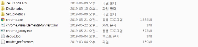 저는 다음과 같이 해결했습니다. 먼저 chrome.exe가 있는 폴더를 보면 맨 위에 74.0.3729부터 시작하는 폴더가 하나 보입니다.
