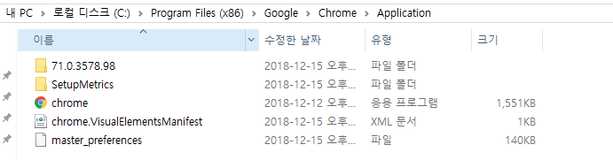 윈도우의 '파일 위치 열기(찾기)' 의 기능으로 찾은 chrome.exe 파일입니다.