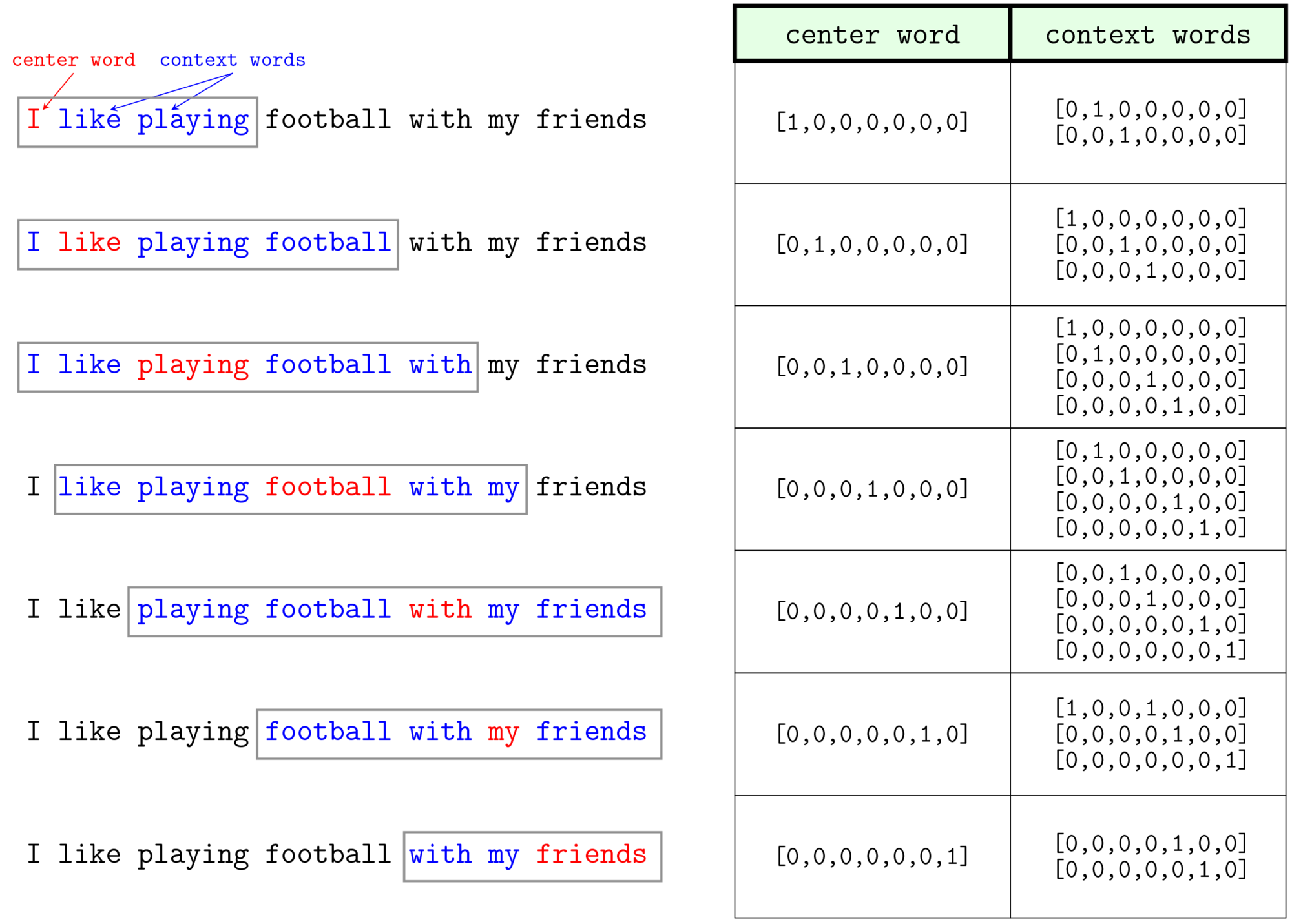 - 한 문장을 가지고 (중심단어+주변단어)를 필터처럼 하여 sliding