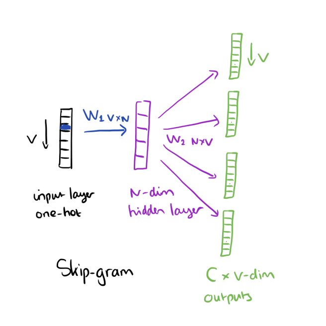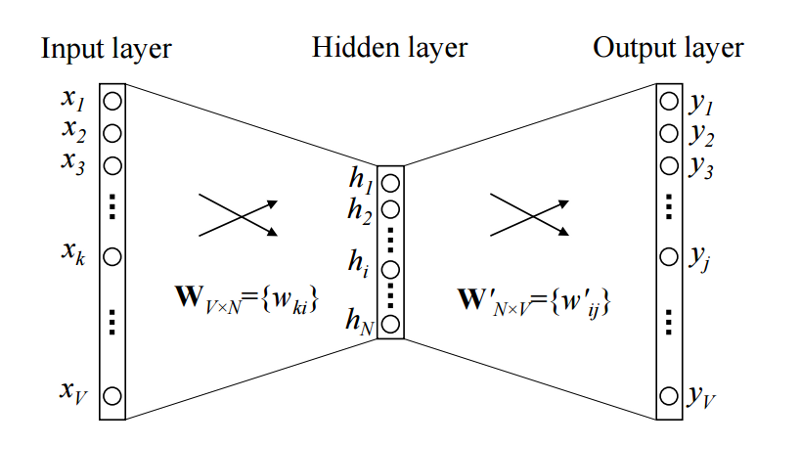input layer: V(vocabulary 벡터가 여러 개(주변 단어 개수만큼)