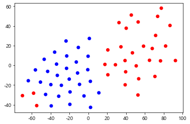 tsne = TSNE(n_components=2) #통계적으로 유의한(variance가 최소가 되도록) 2개의 차원만 남김